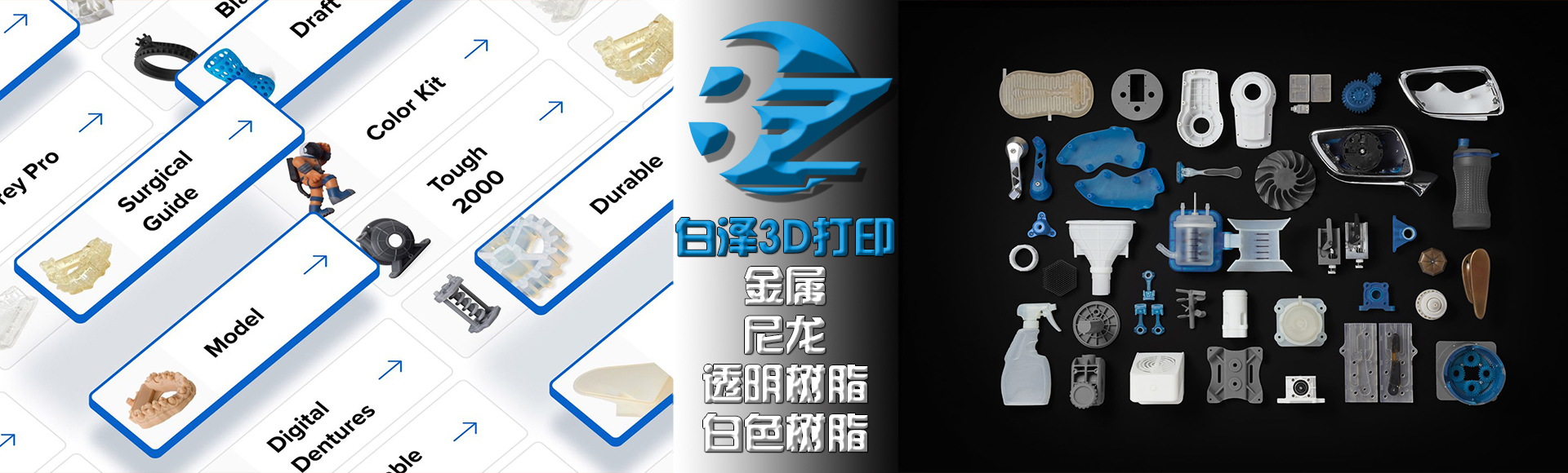 白色树脂、金属、尼龙、透明树脂、高韧性树脂、高耐温树脂等多种进口工程性塑料和高精度树脂,高强度、高韧性、抗冲击、耐磨、防腐蚀、耐高温、阻燃